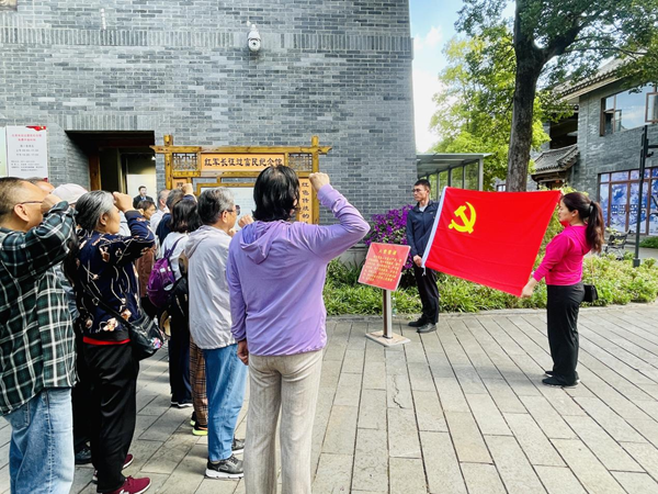 抵达红军长征过富民纪念馆后,主题党日活动正式拉开帷幕。在纪念馆前,全体党员整齐列队,面对鲜红的党旗,庄严地举起右拳,重温入党誓词。
