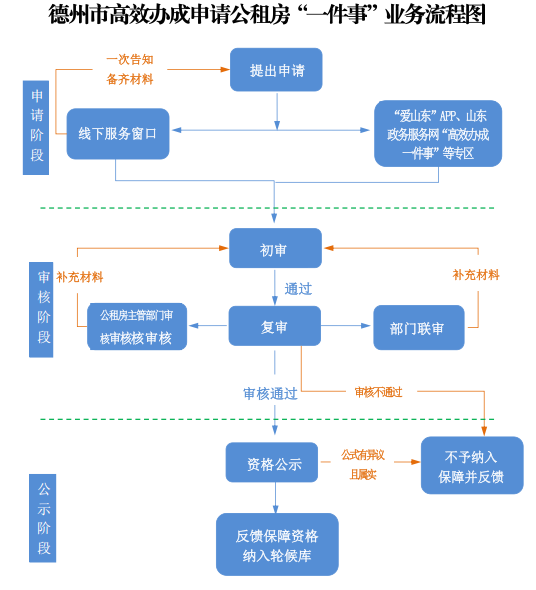 二、优化审核流程。一是合并事项。将“公租房保障对象资格确认”和“公租房租赁补贴资格确认”两个事项整合为一个事项,申请人审核通过后可同时获得租赁补贴和实物配租两类保障资格。二是简化材料。制定全市统一的公租房申请材料清单,公布公租房申请表格范本,将原有分散的6类申请表单整合为1张公租房综合申请表。三是优化流程。印发《德州市申请公租房“一件事”工作实施方案》《德州市申请公租房“一件事”服务指南》,优化工作流程,统一受理条件、申请材料、审核标准等21项服务要素,规范公租房申请业务流程。