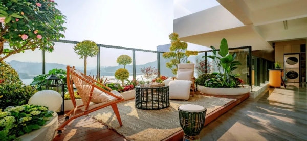 伍投·揽境集传统合院、空中别墅、立体园林等优势,每户赠送挑高6米、27-40㎡超大空中花园,交付时通过覆土管理,在露台可打造私属后花园。