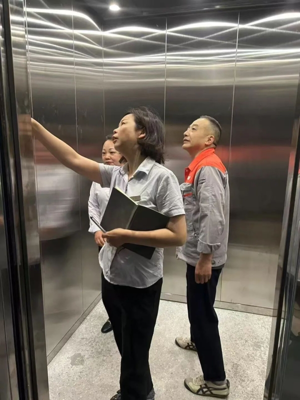 ▲中南二号物业主任冯金兰正在检查电梯日常使用情况