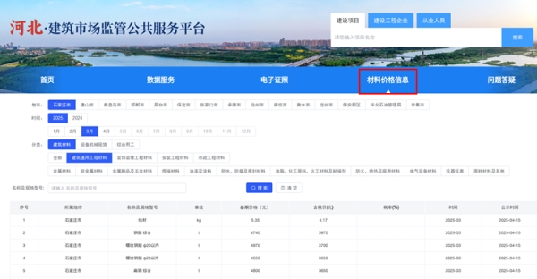 为及时、便捷、准确提供建筑工程材料价格信息,更好服务工程建设,近日,省住房城乡建设厅改进建筑工程材料价格信息发布方式,在“河北省建筑市场监管公共服务平台”开设发布专栏,设置搜索查询、分类筛选等功能,方便各建设、施工、造价咨询、监理单位通过平台了解相关材料价格,提升材料价格信息服务质效。