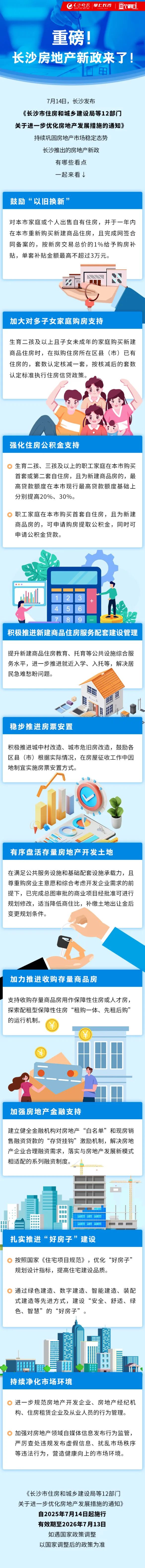 《通知》自2025年7月14日起施行,有效期为一年。同时,市直相关部门将结合实际情况进一步细化对应举措。市住房城乡建设局相关负责人表示,通过供给端、需求端、政策端协同发力,将进一步稳定市场预期,确保长沙房地产市场持续平稳健康发展。