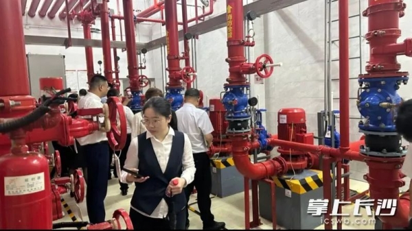 在湘江财富金融中心项目,学习团成员考察了消控室、避难层、配电间、空调机房、消防泵房等重点区域,详细了解超高层安全防范、火灾自救及人员疏散等精细化管理措施。针对湘江财富金融中心项目体量大、超高层建筑这一特点,该项目在消防安全管理方面严格执行“135”工作机制(即1分钟内接警、3分钟内到场、5分钟内处置)。