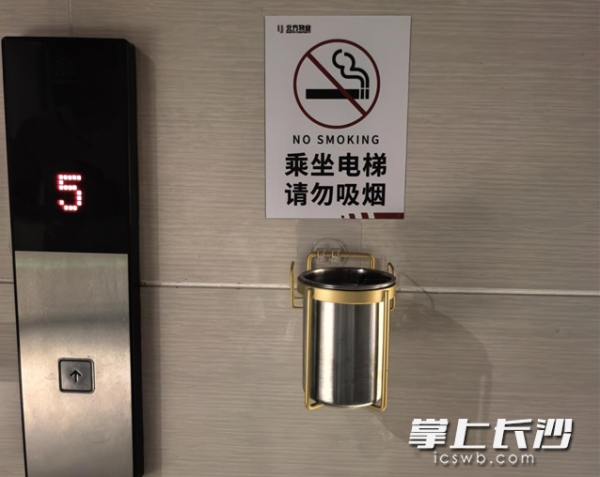 物业在电梯口张贴了禁烟提示卡并安装了烟灰缸。