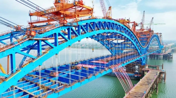 桥梁上部结构施工时,部署了智慧工地管理系统和实时监控监测平台,引入了智能爬坡吊机、智慧塔吊、智能浮吊等大型智能机械,创新“先梁后拱、梁上运梁”悬拼工艺与“水平三角架对拉体系”,前者实现大悬臂钢桁梁的高效拼装,后者以自平衡结构替代传统斜拉扣塔,减少60%现场安装量,兼顾技术创新与生态保护,有效降低了施工风险,大幅提高了作业效能。